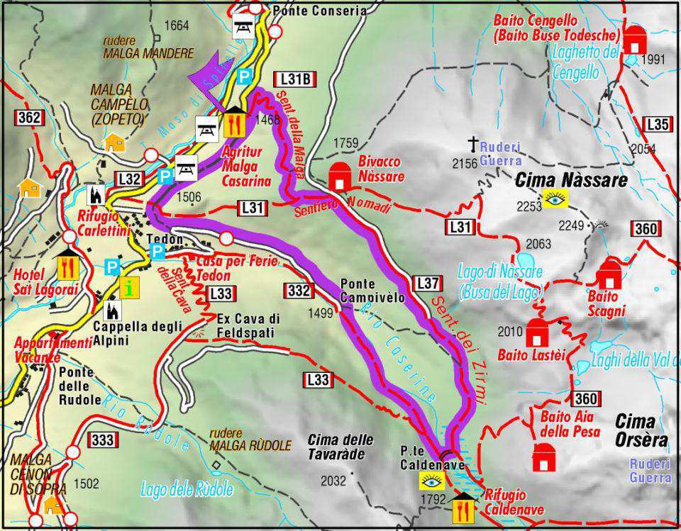 Dal piazzale in Loc. Hotel presso la Cappella degli Alpini, (m 1325) si percorre la strada asfaltata che prosegue verso il Ponte Conseria. Attraversato il ponte sul Rio Caldenave si prende la strada a destra con segnavia bianco – rosso per Caldenave, Forcella Ravetta, Laghi della Val Inferno. Ora la strada diventa bianca salendo fino al primo tornante a sinistra. Qui si imbocca la comoda mulattiera che prosegue fiancheggiando la sponda destra del Rio Caldenave-Casarine. Segnaletica bianco – rosso Caldenave Forcella Ravetta. Prima della Loc. Campivelo il sentiero si immette di nuovo sulla strada forestale che termina in corrispondenza del Ponte Campivelo. 45′. (m 1499) Oltrepassata la passerella sul Rio Caldenave il sentiero incomincia a salire lungo la sponda orografica sinistra. Dopo 1 ora si giunge al campivolo della Malga Caldenave. Giunti al bivio per Forcella Ravetta, si piega a sinistra per circa 50 metri seguendo la segnaletica SAT per Val dell’Inferno giungendo così al Ponte Caldenave. (m 1748).